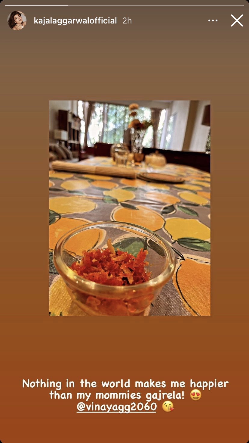 On January 27, 2022, taking to her IG stories, Kajal Aggarwal had shared a picture of how she satisfies her pregnancy cravings. She had shared a picture of her dining table with a glass bowl placed on it, which was filled with a delicacy made by her mommy. Kajal had satisfied her pregnancy craving with ‘gajrela’ made by her mom. Sharing the picture, atop it, Kajal had written: