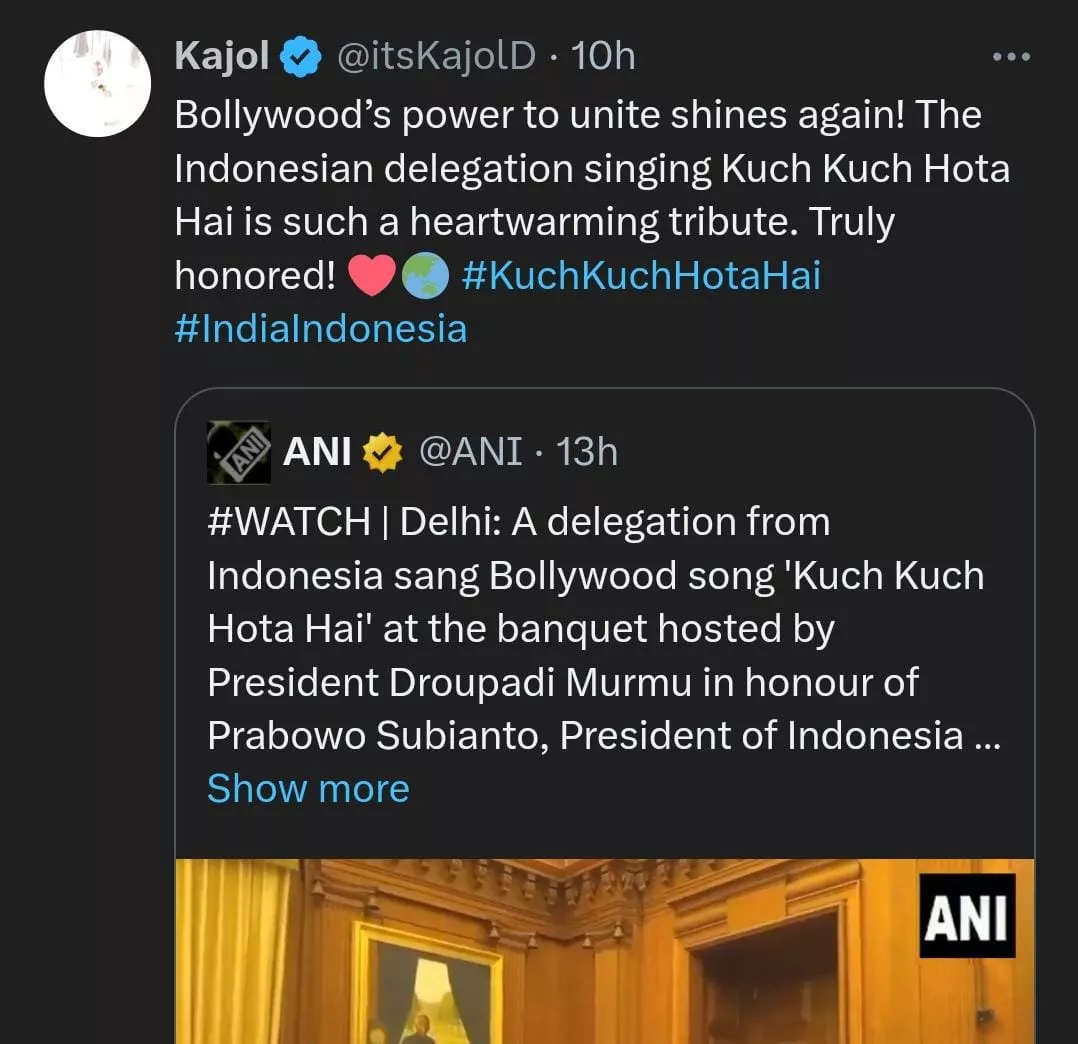 "Bollywood's power to unite shines again! The Indonesian delegation singing Kuch Kuch Hota Hai is such a heartwarming tribute. Truly honored! #KuchKuchHotaHai #IndiaIndonesia."