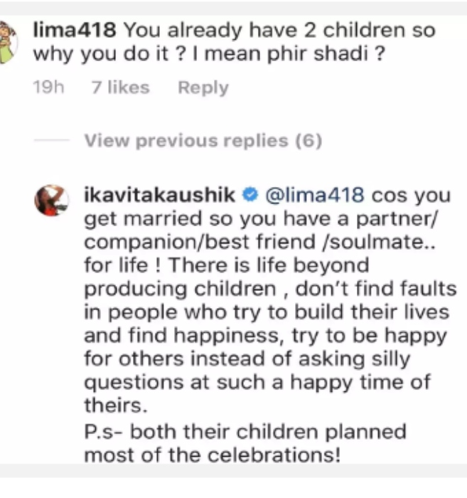 That's when Kamya's best friend and television actress, Kavita Kaushik had decided to give the right lesson to the troller and she had commented, "Because you get married so you have a partner/companion/best friend/soulmate.. for life! There is life beyond producing children, don't find faults in people who try to build their lives and find happiness, try to be happy for others instead of asking silly questions at such a happy time of theirs. Both their children planned most of the celebrations!" (Don't Miss: Shoaib Ibrahim Takes His Wife, Dipika Kakar Out For A Date Night, Shares A Beautiful Picture)