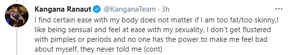 The actress added in her note that no one had ever told her that she would be picking up so many prestigious awards and would be at the peak of her acting career at the age of 34. She added, "Today I turned 34, they never told me, I will be at the peak of my career at 34, I will be celebrated for my art, and my experience will be valued and my age or marital status would mean nothing to anyone, I feel like a superhuman loaded with exceptional experience about skills." Kangana also talked about feeling confident in her body. She stated, "I find certain ease with my body does not matter if I am too fat/too skinny, I like being sensual and feel at ease with my sexuality, I don't get flustered with pimples or periods, and no one has the power to make me feel bad about myself, they never told me." (Don't Miss: Trishala Dutt's Reaction To Her Father, Sanjay Dutt's New Haircut Is Every Daughter Ever)
