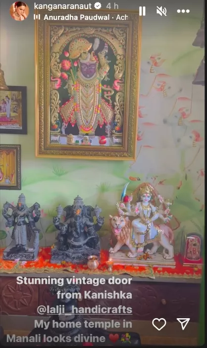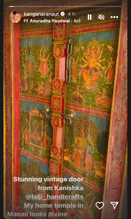 Kangana is a pure sanatani by heart, and proof of the same is often found. For instance, on January 2, 2024, Kangana took to her Instagram handle and shared an IG story giving a glimpse of her vintage mandir door in her Manali home. The door had huge metal handles with chain locks, and beautiful paintings of Ganpati Bappa and other Hindu deities. We can also get a glimpse from inside the mandir, wherein she has placed a beautiful idol of Goddess Durga and Ganpati Bappa's idol.