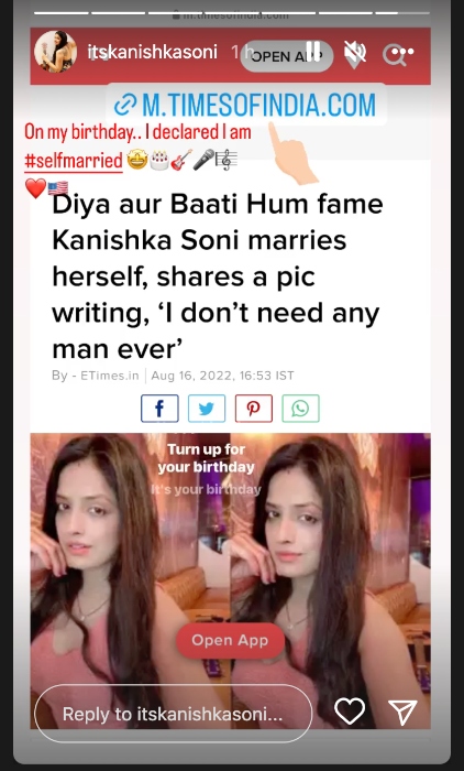 On August 16, 2022, Kanishka took to her Instagram stories, and posted a screenshot of a news story on her from The Times Of India. Atop it, she announced that she is married to herself. The actress wrote: