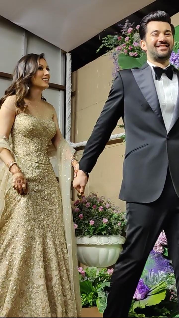 A few minutes ago, on June 18, 2023, we stumbled upon the first glimpse of Karan Deol and his wife, Drisha Acharya from their wedding reception. In the video, she was seen walking hand-in-hand with her husband towards the dias, wherein they posed for the paps stationed outside the reception venue. For the reception, Karan looked handsome in a black tuxedo with a crisp white shirt underneath and a bow. On the other hand, Drisha stunned in a beige-hued embellished lehenga paired with a corset top and a matching sheer dupatta. She amped her look with minimal makeup, an open wavy hairdo and diamond jewellery, including statement earrings and bangles.