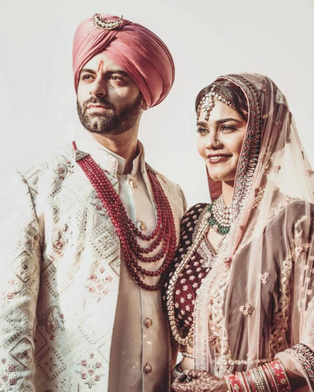 Now about their wedding and reception, Karan Godhwani tied the knot with his longtime ladylove in a plush Mumbai banquet, with their family members and few friends from the industry by their side. For their wedding, Karan must have given #DulheGoals to many in a collared-shirt, open bandhgala jacket, layered motihaar and a pagri on his head. His wife, Tanya looked ravishing in a maroon lehenga choli, kundan choker, single-layered matha patti, embellished chooda and minimal makeup. Here’s the picture from their wedding: