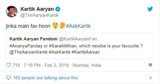 During a recent Twitter interaction, there happened a new twist on the Kartik-Sara-Ananya saga, when a user asked Kartik which 'newbie' among Sara Ali Khan and Ananya Panday was his favourite. The Pyaar Ka Punchnama debutant left a somewhat cryptic reply, "Jinka main fav hoon (whoever considers me their favourite)."