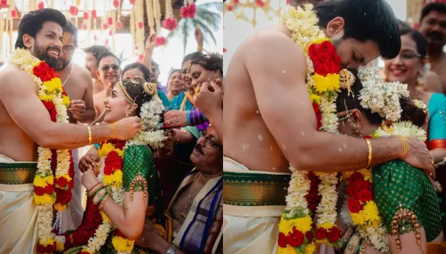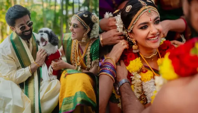 Keerthy Suresh shared breathtaking moments from her destination wedding in Goa, her attire a stunning yellow-toned saree with green borders, accentuated by a magenta-toned sleek paar. The photos exude love, joy, and laughter.