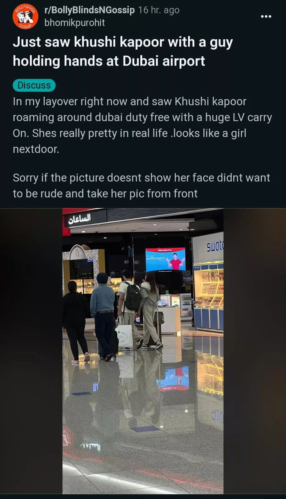"Just saw khushi kapoor with a guy holding hands at Dubai airport. In my layover right now and saw Khushi kapoor roaming around dubai duty free with a huge LV carry On. Shes really pretty in real life. Looks like a girl next-door. Sorry if the picture doesnt show her face didnt want to be rude and take her pic from front."