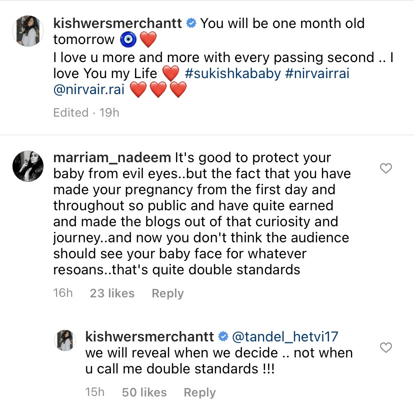 As Kishwer has not revealed her son’s face yet, it irked one of her followers, who called the actress out and shared that it is double standards on her part. She commented, “It's good to protect your baby from evil eyes..but the fact that you have made your pregnancy from the first day and throughout so public and have quite earned and made the blogs out of that curiosity and journey..and now you don't think the audience should see your baby face for whatever resoans..that's quite double standards.” Slamming the user, Kishwer replied, “We will reveal when we decide.. not when u call me double standards !!!”