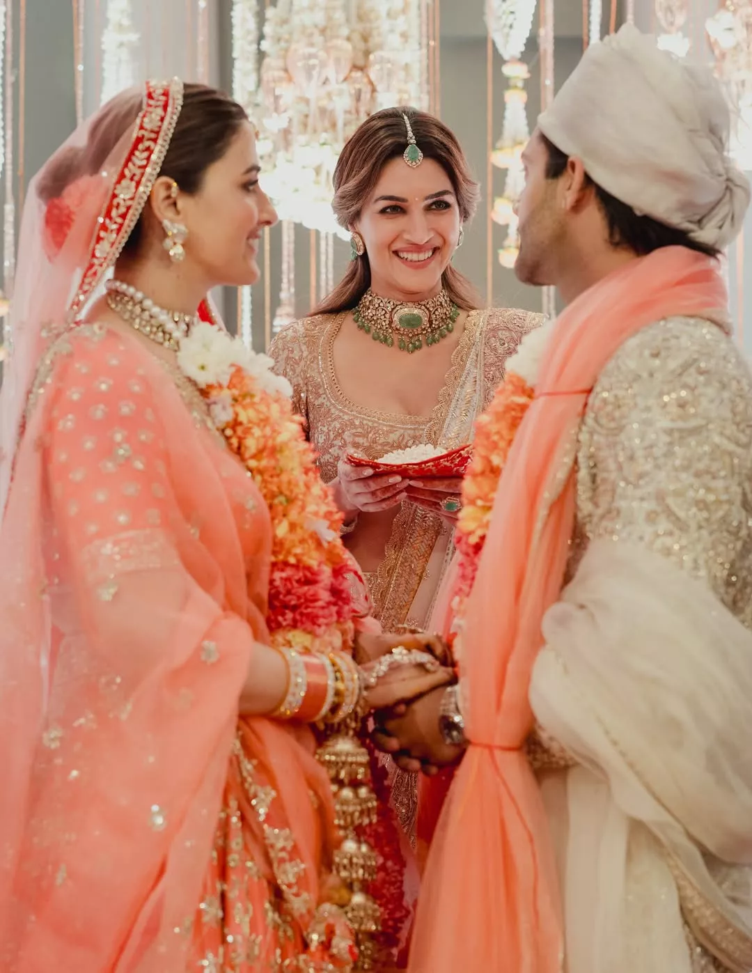 "Wishing you both a lifetime of happiness and love. She is my JAAN and I know she’s yours too.. for life! I’m never really “Giving her away”, so Welcome to the Sanon family. P.S. Nupur Sanon even though I know you’re gonna be 20min away and will keep coming home, the house really feels empty without your laughter, but I’m happy you’ll be spreading joy in 2 houses now.."