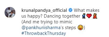 On March 18, 2021, Indian cricketer, Krunal Pandya took to his Instagram handle and shared a cutesy dance video with his gorgeous wife, Pankhuri Sharma on the iconic song, Kajra Re from the movie, Bunty Aur Babli. In the video, the couple looked stunning in their respective outfits, as they can be seen twinning in the shades of silver. Their romantic camaraderie in the video is winning everyone's hearts all over the internet, as the dance video is getting viral on social media. While one side, Pankhuri looked breathtakingly beautiful in her sharara suit. On the other side, her husband, Krunal looked handsome in his well-tailored kurta-pyjama. Along with the video, Krunal penned a lovely note, and it can be read as "What makes us happy? Dancing together (And me trying to mimic @pankhuriisharma's steps) #ThrowbackThursday." Soon, his wife, Pankhuri dropped a mushy comment that can be read as "KP" followed by a monkey covering his eyes emoji. Also, Krunal's brother, Hardik penned a comment that reads "Hahaha cutie". Take a look:
