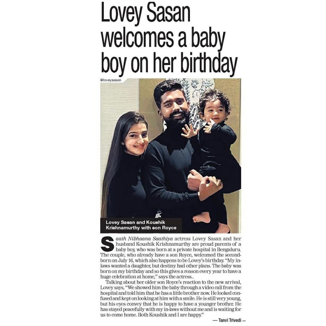 Lovey Sasan had tied the knot with Koushik Krishnamurthy on February 10, 2019, and they had welcomed their first baby, Royce, in February 2020. It was on her birthday, i.e., July 16, 2021, when Lovey had become a mother for the second time and had shared the same in an interview with The Times Of India. A few days later, Lovey had taken to her IG handle to announce the news with her fans by sharing an article from a newspaper and had captioned it as "Oh Boy!"