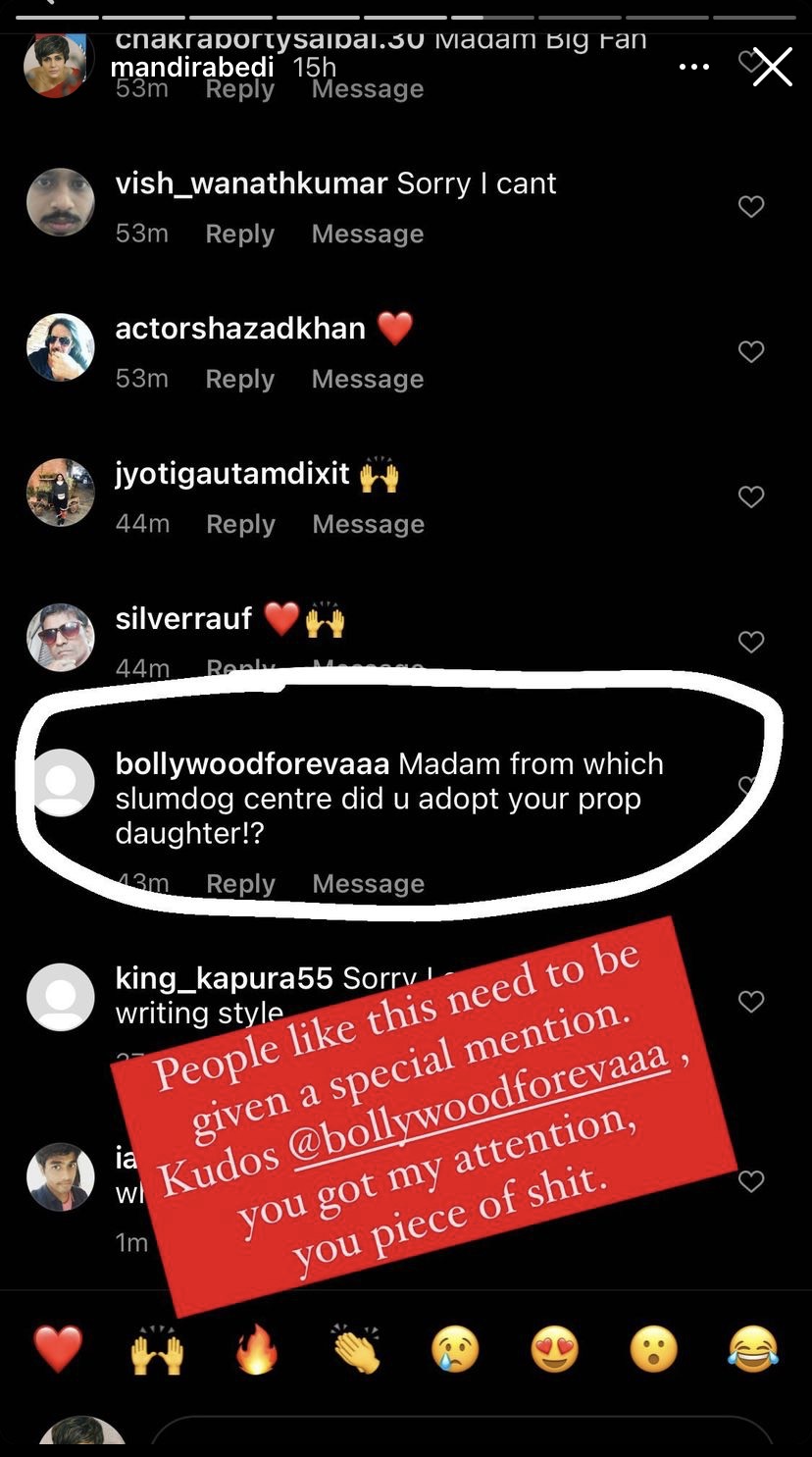 She then shared another screenshot of the same user, messaging her and targeting her daughter, Tara. The user called Tara, a kid from slumdog centre and Mandira, a greedy Narcissist. The message can be read as “The adopted street kid looks completely out of place…u greedy narcissists are scarring the slumdog for life.” To this, Mandira gave a savage reply and wrote, “More from the model citizen. He calls himself Rajesh Tripathi, which definitely isn’t his name, because sickos like this are the biggest cowards too, who only know how to wag their tongues behind the shield of anonymity” atop the screenshot shared on her IG stories.