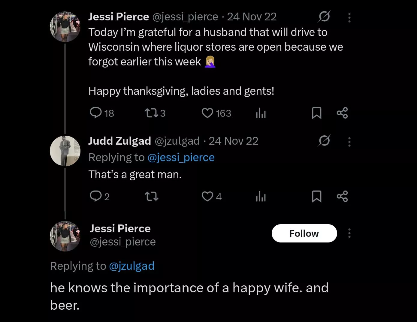 Jessi Pierce was known for being a fun personality associated with the Minnesota hockey community. She often shared relatable glimpses of her life as a mother and wife on social media. Her posts showcase her dynamics with her husband, Mike Hinrichs, giving a rare insight into her life away from broadcasting. Following her death, a Thanksgiving post of hers from 2022 has resurfaced, in which she expressed gratitude to Mike for driving all the way to Wisconsin just to find an open liquor store for the celebrations, since they had forgotten to stock up beforehand. The post could be read as: