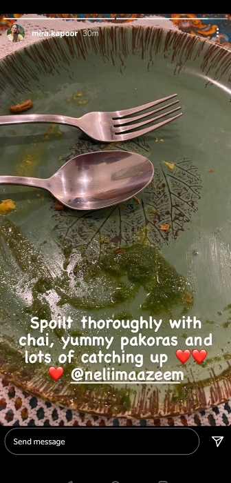 Mira often shares snippets of her life on her Instagram handle for her fans. On December 23, 2020, Mira had given us a glimpse of her beautiful relationship with her mom-in-law, Neliima ji. She had posted an IG story, wherein we could see an empty plate with a little bit of chutney. Atop it, Mira had written, "Spoilt thoroughly with Chai, pakoras and lots of catching up @neliimaazeem."