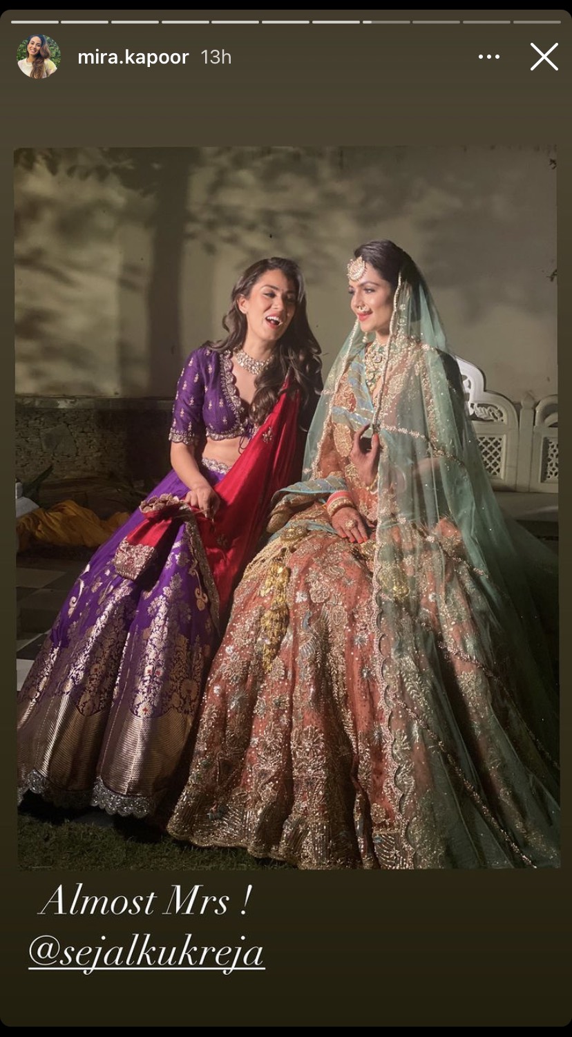 For Sejal Kukreja’s pre-wedding festivity in 2020, Mira Rajput Kapoor had made our hearts swoon in a drop shoulder Fuschia organza ruffled jumpsuit with ruffled chiffon dupatta and boho belt by Ridhi Mehra. Mira’s stunning outfit had cost Rs 62,800 and she had treated her fans with glimpses of the function. Posting one of the selfies as her Insta story with Tanisha Bawa, she had written, “Brideys Sideys” atop it. Mira had also reposted a girls’ squad photo that Sejal had posted on her Insta story, which had “Not walking that path without my girls!” as the caption. (Don't Miss: Navya Naveli Nanda Claps Back At A Troll Who Targeted Her Mother Shweta Bachchan Nanda, Like A Queen)