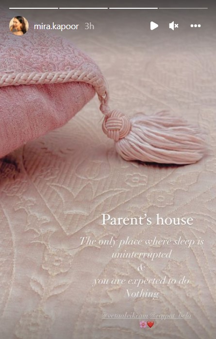 It seems like Mira is in her maayka and is enjoying every moment of it. On May 13, 2022, Mira took to her IG stories and posted a picture of her comfortable pillow and revealed how life at her parent's home is bliss. Her post was quite relatable as she captioned the picture as: