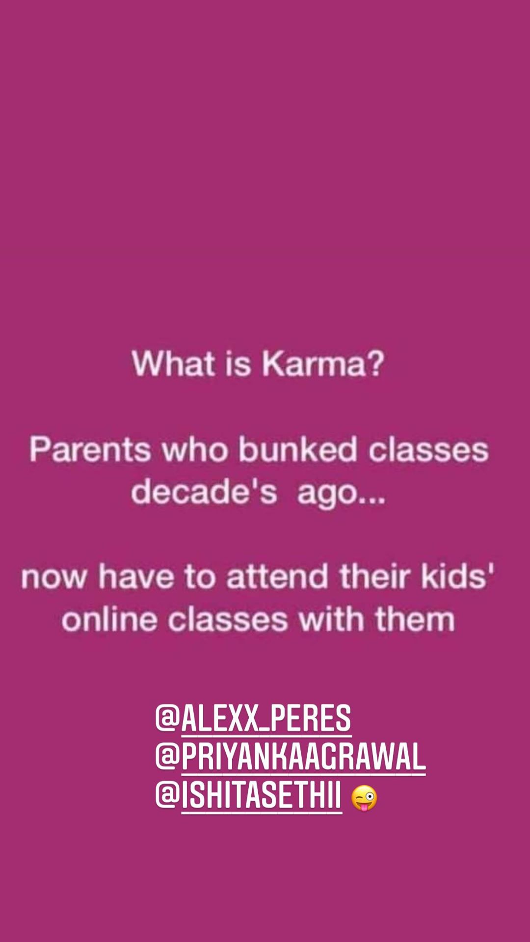 Some days ago, Mira Rajput Kapoor had hosted an an 'Ask me anything' session with her fans on her IG handle, wherein one user had probed her on further family planning and had asked, "Third child?" To which, Mira had replied, "Hum do humare do." On August 18, 2020, Mira had posted a funny note on her IG stories for the parents, who are forced to attend online classes with their kids. And it was very relatable! The note which Mira had shared could be read as "What is Karma? Parents who bunked classes decades ago. Now, have to attend their kids' online classes with them."
