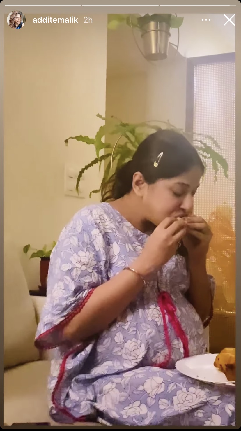 Now, taking to her IG stories, Aditi has shared how her aai helped her to satisfy her pregnancy craving. In the video, Aditi can be seen wearing a kimono and sitting on her couch with her aai, with a plate filled with vada pav, lying on her lap. Aditi can be seen enjoying vada pavs with her aai sitting next to her. As someone recorded her, she said, “Khane do na! 4-4 le kar baithi hoon Amazing!” Sharing the video, she wrote, “Ghar pe raho aur Vada Pav khao” in Hindi and “Love you Aai” followed by a red heart emoticon atop her story. Take a look at the screenshots here: