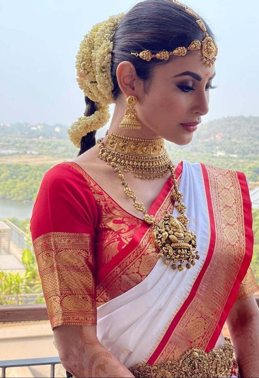 For their Malayali wedding, Mouni Roy had donned a white and red Kanjivaram saree with temple jewellery. On the other hand, her then-boyfriend, now-husband, Suraj Nambiar had looked handsome in a beige-coloured kurta with white dhoti.