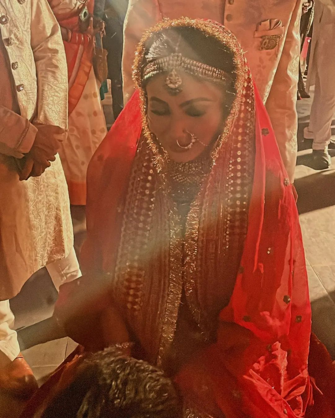 On January 27, 2022, Mouni tied the knot with Suraj Nambiar again as per the Bengali rituals. For her second wedding ceremony, Mouni wore a red-hued Sabyasachi Mukherjee lehenga. She accentuated her look with a statement neckpiece, a matha patti and a nath. Subtle makeup with soft smokey eyes completed her look.