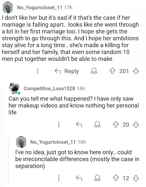 Another fan shared that Bhumika suffered a lot in her first marriage, too, so the turmoil in her second marriage is sad. The fan wrote, "I don’t like her but it’s sad if it that’s the case if her marriage is falling apart.. looks like she went through a lot in her first marriage too. I hope she gets the strength to go through this. And I hope her ambitions stay alive for a long time.. she’s made a living for herself and her family, that even some random ten men put together wouldn’t be able to make."