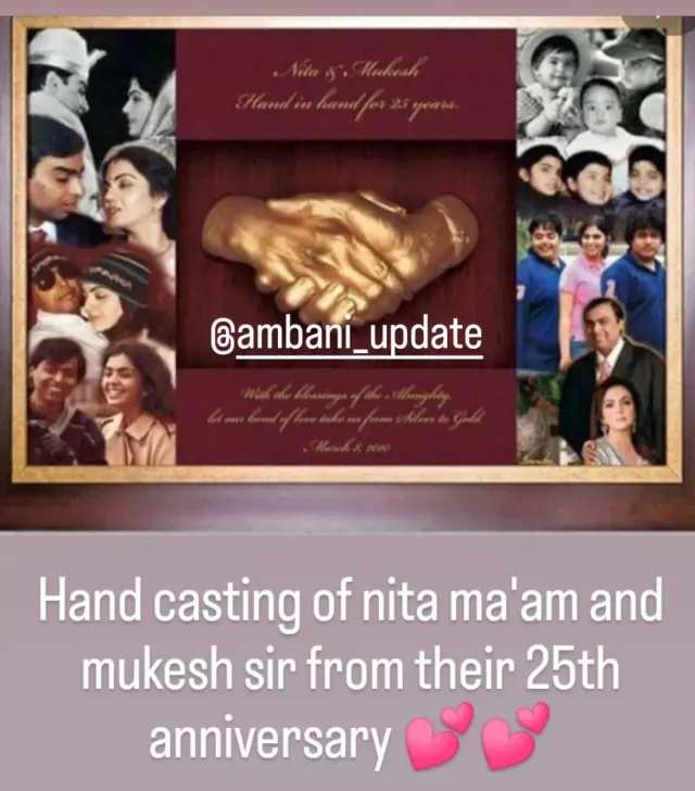 Earlier, we stumbled upon a glimpse of a meaningful gift that Nita Ambani and Mukesh Ambani received on their 25th anniversary. The gift was a gold hand-casting, which was made inside of a red-toned frame in the middle, sided with several love-filled photos of the couple. The header and footer of the middle frame that held the hand-casting had a message of the couple, that could be read as: