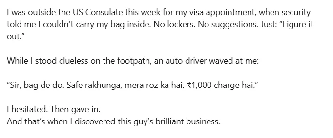 "I was outside the US Consulate this week for my visa appointment, when security told me I couldn’t carry my bag inside. No lockers. No suggestions. Just: Figure it out. While I stood clueless on the footpath, an auto driver waved at me. 'Sir, bag de do. Safe rakhunga, mera roz ka hai. Rs. 1000 charge hai.' I hesitated. Then gave in. And that’s when I discovered this guy’s brilliant business."