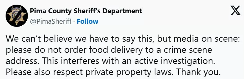"We can’t believe we have to say this, but media on scene: please do not order food delivery to a crime scene address. This interferes with an active investigation. Please also respect private property laws. Do not order food to a crime scene and it will disrupt active police work."