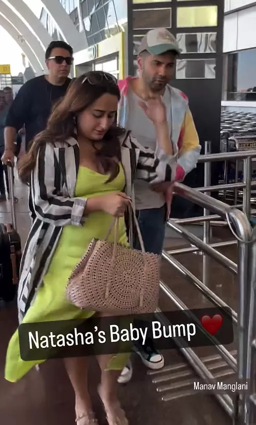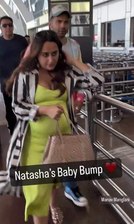On February 21, 2024, Varun Dhawan and Natasha Dalal were spotted by the paps at the airport. For the outing, Varun looked dapper in a white t-shirt layered with a tie-dye shirt and matching pants. On the other hand, his pregnant wife, Natasha, opted for a neon green-hued dress with a slit near the knee and styled it with an open shirt jacket. Leaving her tresses open, she completed her look with a pair of flats. However, it was Natasha's grown baby bump that caught our attention.