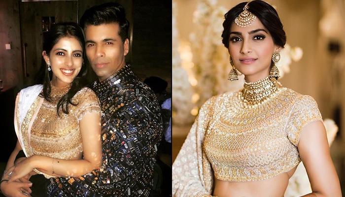 And now, Navya Naveli Nanda’s mother, Shweta Bachchan Nanda posted an adorable picture of her daughter with Bollywood ace director-producer, Karan Johar, from one of Akash Ambani and Shloka Mehta's pre-wedding celebrations. Navya and Karan can be happily seen posing for the cameras. But what caught our attention was Navya’s outfit which looked very similar to the one that Sonam Kapoor wore on her mehendi ceremony. Navya wore the graceful white and gold choli and carried it with the same panache as Sonam. Check it out: