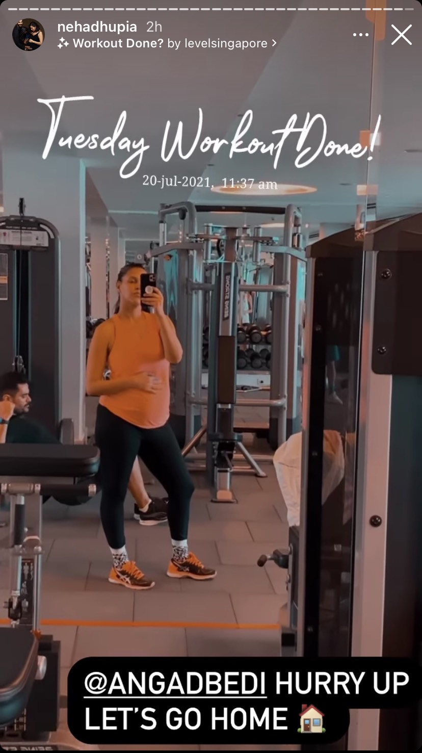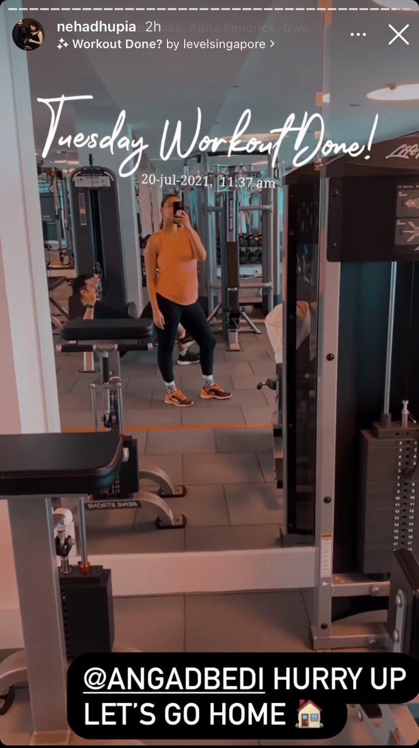 Like all the pregnant actresses of recent times, Neha Dhupia has also been ensuring to debunk the myth regarding working out during pregnancy. On July 20, 201, Neha Dhupia had shared a video on her IG stories, where she was working out with her husband, Angad Bedi. In the video, while at first Angad was working out, later, Neha was seen recording herself in the mirror and caressing her baby bump. Neha had opted for an orange vest and black jegging for her workout session. She had written, “@Angadbedi hurry up let’s go home” atop it.