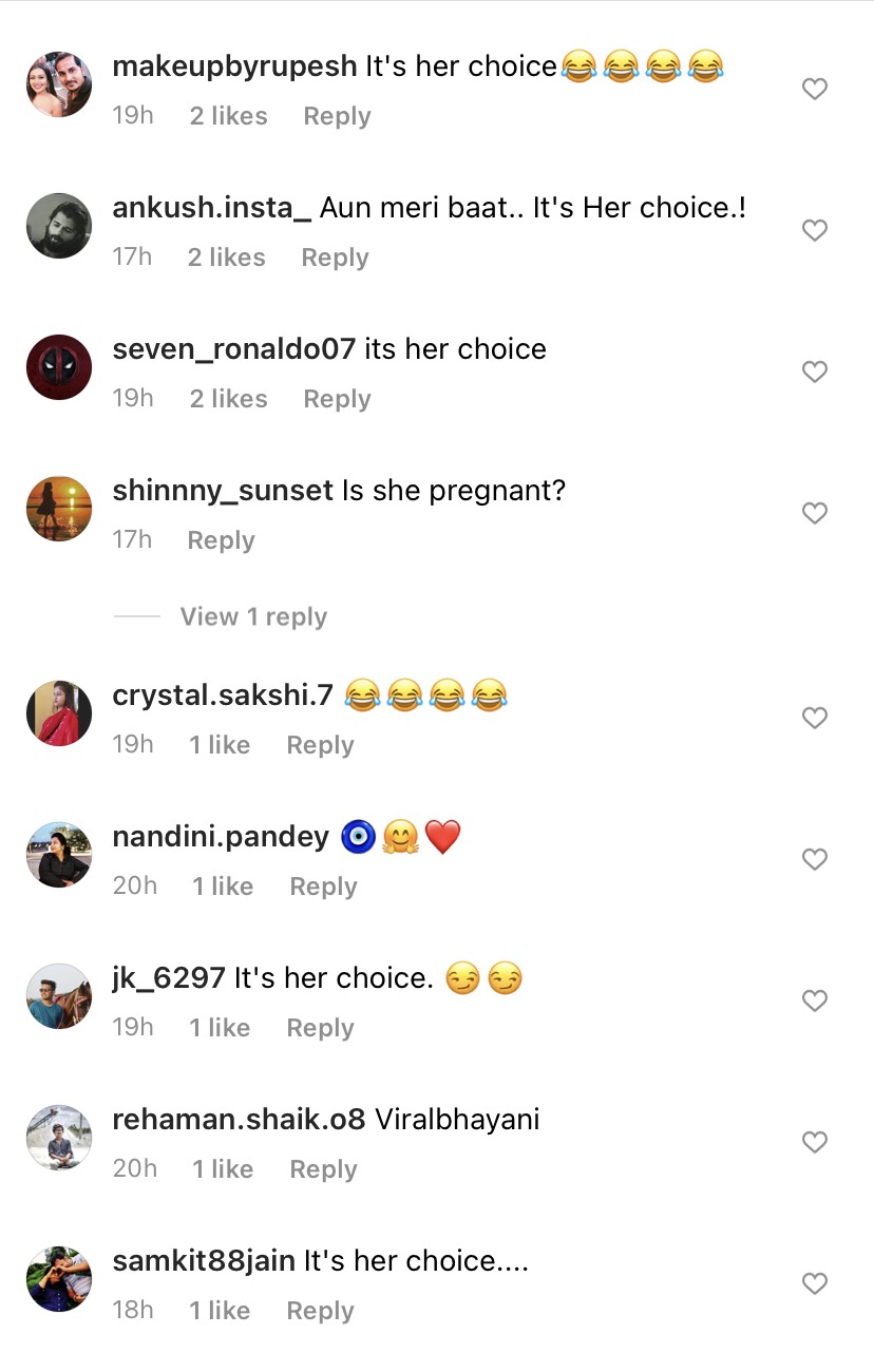 On Neha and Angad’s picture, while one user commented, "Pregnant ?? Oh... "it's her choice." Another one wrote, "Guys stop commenting it’s her choice coz it’s her choice." One of the users wrote, “Oeee sun it's her choice." Another troller targeted her pregnancy and wrote, "Phirse??...ok it's her choice BTW."