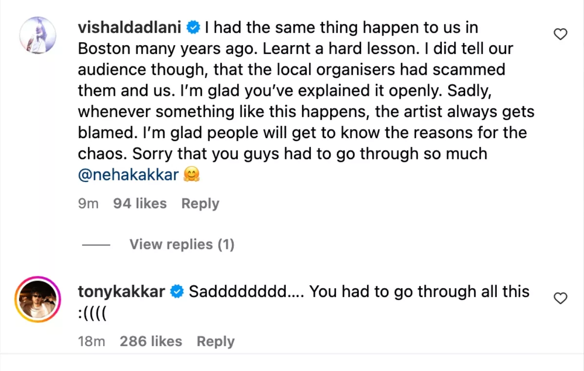 "I had the same thing happen to us in Boston many years ago. Learnt a hard lesson. I did tell our audience though, that the local organisers had scammed them and us. I’m glad you’ve explained it openly. Sadly, whenever something like this happens, the artist always gets blamed. I’m glad people will get to know the reasons for the chaos. Sorry that you guys had to go through so much @nehakakkar"
