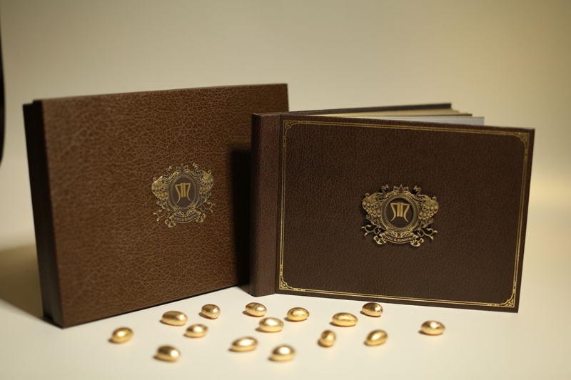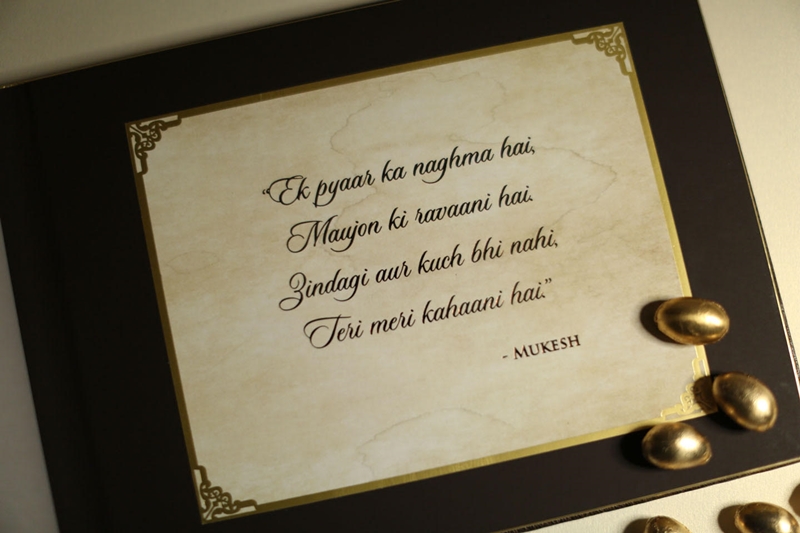 The invite has been designed like a coffee table book in which each page reads out a different story about the couple. It is like a fairytale being narrated, with lyrics from Neil’s grandfather and famous musician Late Mukesh ji’s iconic songs printed before each new page of the card. Every invite has been sent out with a box of delicious chocolate-walnut brownies from ‘Country Of Origin’ and an embossed semi-precious coin.