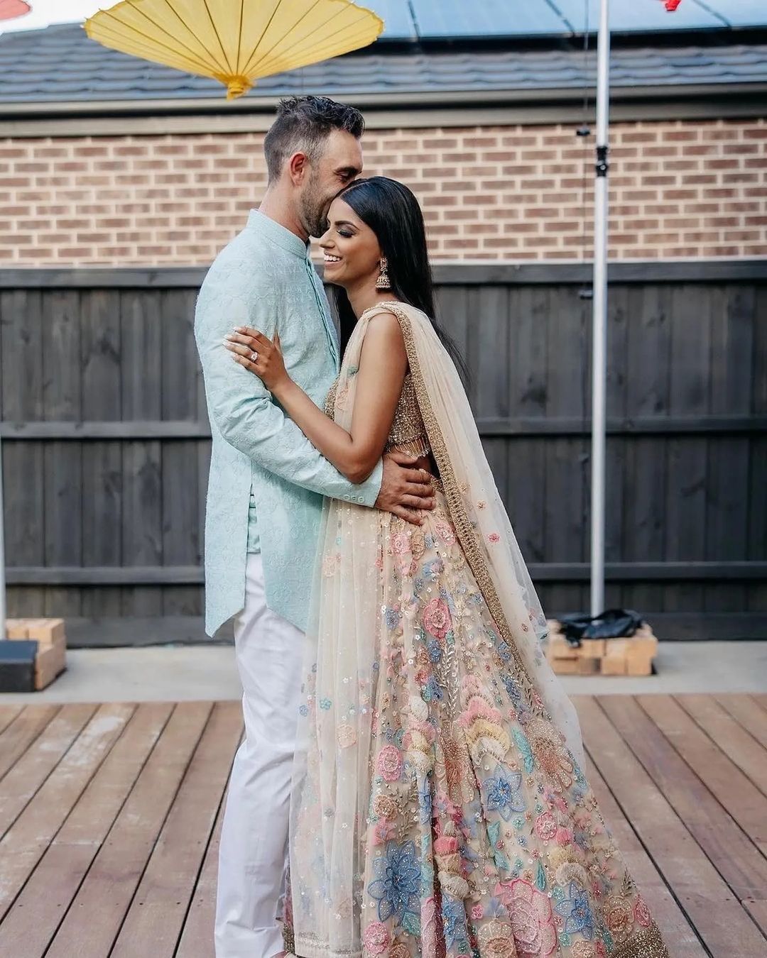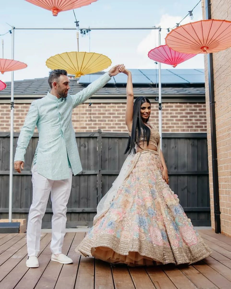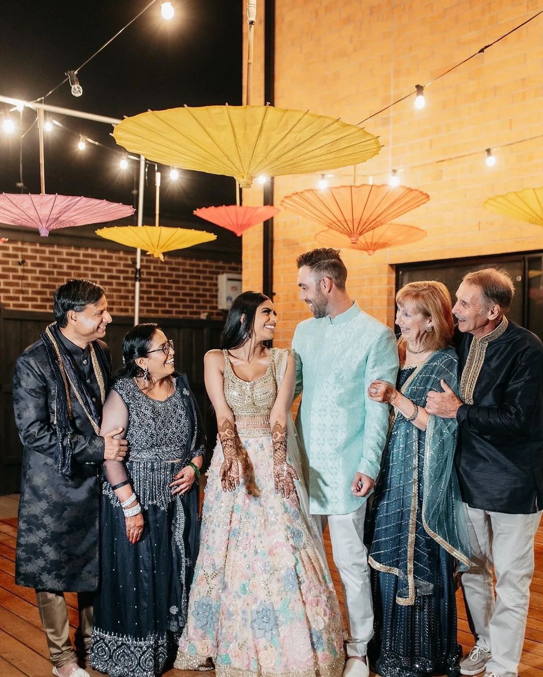 Just a while back, a media page, Weddingz.in took to its Instagram handle and shared a series of pictures from the newlyweds, Glenn Maxwell and Vini Raman's mehendi ceremony. In the pictures, the duo's bridal glow was unmissable as they had posed for the click. Glenn was seen wearing a sky-blue-coloured bandhgala suit paired with a white churidar, and his wife, Vini looked stunning in a white-hued lehenga that featured pastel-coloured gota patti works all over it. In some of the pictures, we can also see Glenn and Vini's parents posing with them, donning navy-blue-coloured ensembles. Altogether, the newly married couple, Glenn and Vini looked picture perfect.
