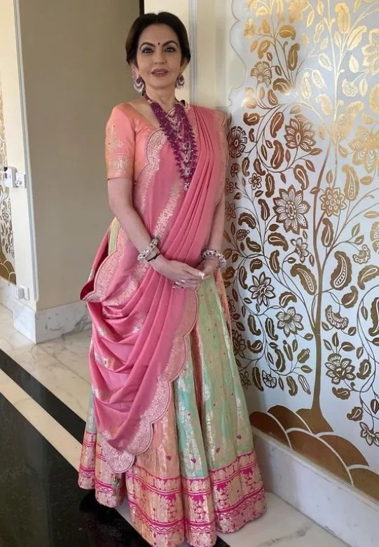 Famous celebrity makeup artist, Mickey Contractor posted a stunning picture of Nita as she was dressed in a Banarasi lehenga. The businesswoman donned a sea-green lehenga, which she teamed up with a pink choli. Her pink dupatta was neatly tucked on her shoulder. Nita accessorised her look with a multi-layered ruby necklace and matching earrings and kadas. With her hair tied in a bun, Nita kept her look subtle.
