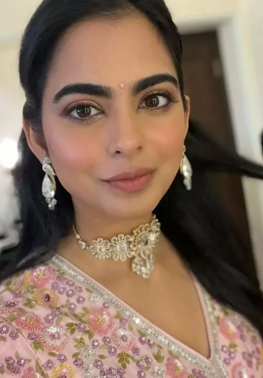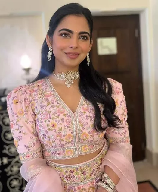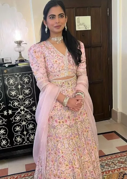 One of the fan pages of the Ambani clan also shared a picture of Isha Ambani from Udaipur, and her stunning look won our hearts. Dressed in a baby pink floral lehenga from the shelves of designer duo, Abu Jani Sandeep Khosla, Isha looked gorgeous. She accessorised her lehenga with a diamond choker necklace with matching diamond earrings and bangles. With her half-tied hair, Isha opted for sheen makeup.
