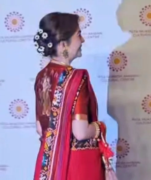 Nita Ambani's fashion game is always on point, and she never misses a chance to impress us all with her looks. For a recent event at NMACC, she donned a gorgeous red-hued silk patola saree with intricate detailing in multiple hues all over its border. She paired the saree with a matching blouse, but the graphic work on the blouse stole the show.