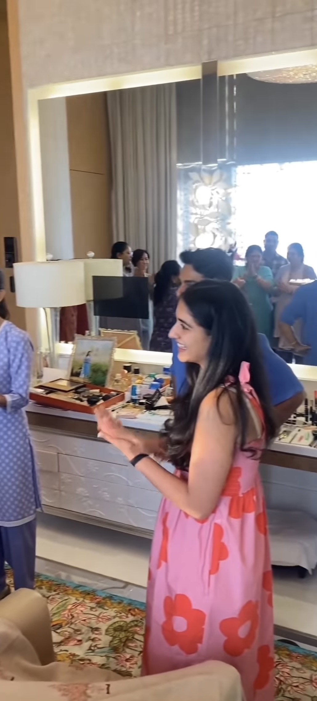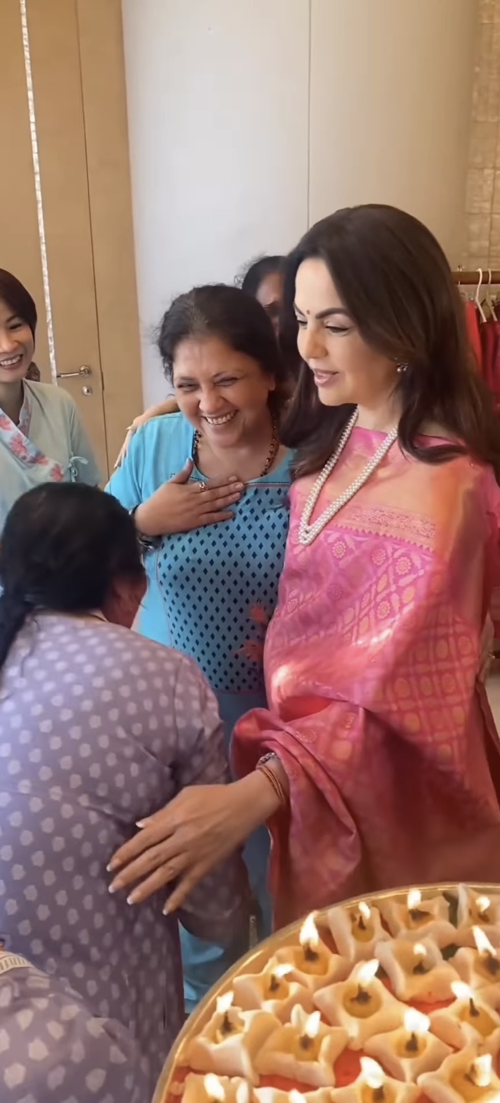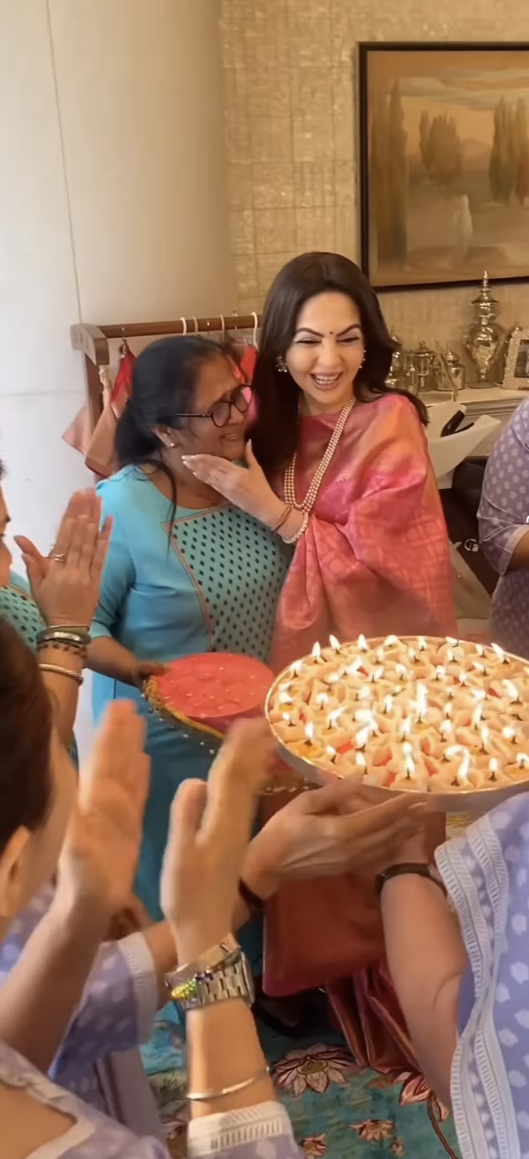Nita Ambani also got a sweet surprise from her staff on her special day. In a video doing rounds on the internet, the businesswoman was seen getting overwhelmed as her staff paid her a visit inside her dressing room. The ladies performed Nita Ambani's aarti with a huge round thali adorned with multiple diyas and also sought her blessings. Nita thanked them for their sweet gesture and hugged all of them individually. Radhika, who was also standing on the side, was in complete awe of the heart-warming moment.