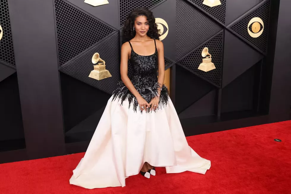 For her feathery presence at the Grammys 2026, Olivia Dean opted for a white-and-black-toned outfit. The dress was from Chanel and featured feathers and sparkly details. The dress had strappy sleeves and a glitter-filled bust, while the hemline featured feathery details. The lower portion of the dress was voluminous, and she paired it with a pair of matching heels from Chanel.