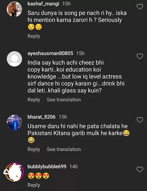 As soon as the video surfaced online, netizens in large numbers flooded the comment section. While some praised Kinza’s performance, others rebuked her obsession with Bollywood movies. Some netizens even defended the actress and said that she was just having fun and there was nothing wrong with it. Check the comments: