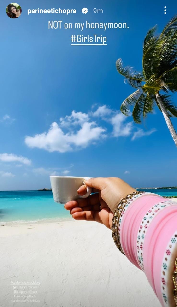 On October 16, 2023, Parineeti Chopra took to her IG handle and dropped a story, wherein we can see the diva enjoying the lazy morning on the breezy, sun-soaked beach. She shared a stunning photo of her hand holding a cup, and we can also spot her pink chooda. Sharing the photo, Pari clarified that she is not on her honeymoon, but rather, she is out to spend some quality time with her girls' gang.