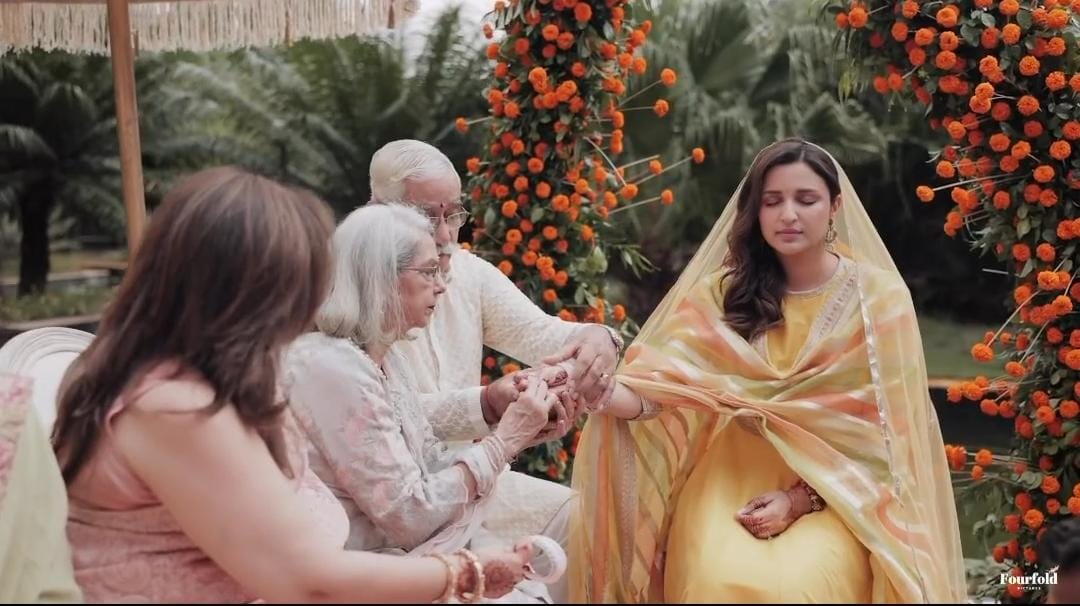A month after Parineeti Chopra and Raghav Chadha's wedding, on October 24, 2023, their wedding photo and videographer took to their official IG handle and shared an unseen video from their pre-wedding rituals. In the video, we got an insight from Parineeti's chooda ceremony, wherein the then-bride's hands were decked with the traditional bangles by her relatives. For the ceremony, she looked stunning in a yellow-hued suit paired with double dupattas, a sheer one as a veil on her head and a multi-coloured one tucked on her shoulders. Along with this, she opted for soft curly hair and subtle makeup to complete her overall look.
