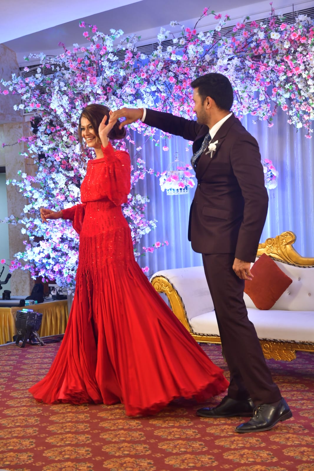 On August 27, 2022, Sangram Singh and Payal Rohtagi hosted a grand reception for the third time and also arranged a press conference afterwards. For the event, the newlyweds looked every bit royal in their stunning outfits. Payal donned a shimmery red gown thigh-slit pleated dress. The actress completed her look with minimal jewellery and classy makeup. She radiated her bridal glow in the pictures. On the other hand, Sangram looked handsome in a navy blue tuxedo paired with a blue tie and a white shirt. Altogether, they looked simply stunning for the day. Check it out: