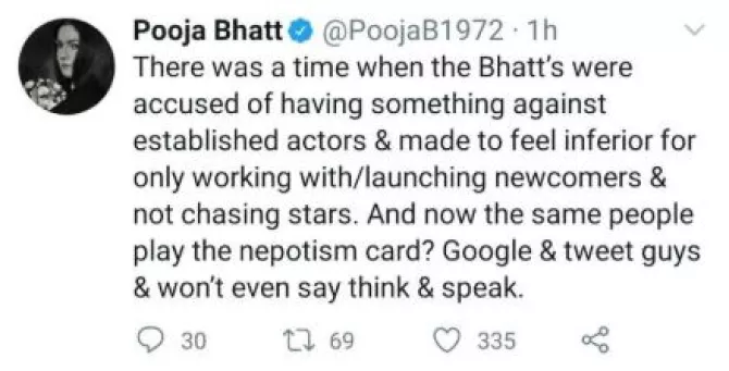 Continuing further, she had written how earlier her father was accused of not working with established actors. She had tweeted, “There was a time when the Bhatt’s were accused of having something against established actors & made to feel inferior for only working with/launching newcomers & not chasing stars. And now the same people play the nepotism card? Google & tweet guys & won’t even say think & speak."