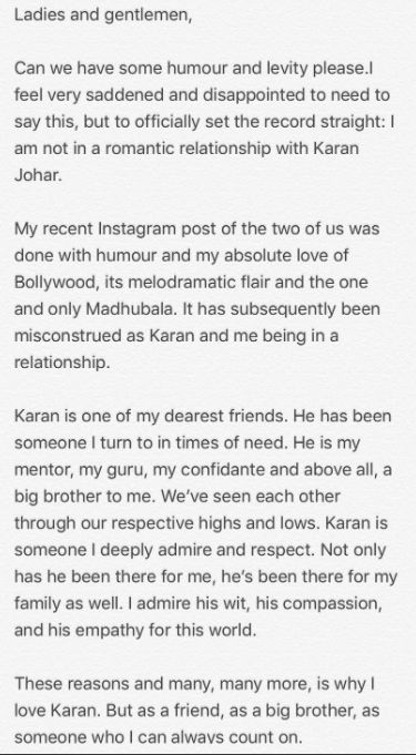 Prabal Gurung’s note denying reports of his romantic relationship with Karan Johar could be read as, “Ladies and gentlemen, Can we have some humour and levity, please. I feel very saddened and disappointed to need to say this, but to officially set the record straight: I am not in a romantic relationship with Karan Johar. My recent Instagram post of the two of us was done with humour and my absolute love of Bollywood, its melodramatic flair and the one and only Madhubala. It has subsequently been misconstrued as Karan and me being in a relationship. Karan is one of my dearest friends. He has been someone I turn to in times of need. He is my mentor, my guru, my confidante and above all, a big brother to me. We've seen each other through our respective highs and lows. Karan is someone I deeply admire and respect.”