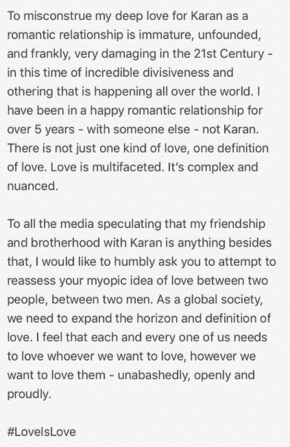 Sharing that his words were misconstrued and admiring Karan Johar for his compassion and empathetic nature, Prabal Gurung’s note further reads, “Not only has he been there for me, but he's also been there for my family as well. I admire his wit, his compassion, and his empathy for this world. These reasons and many, many more, is why I love Karan. But as a friend, as a big brother, as someone who I can always count on. To misconstrue my deep love for Karan as a romantic relationship is immature, unfounded, and frankly, very damaging in the 21st Century -in this time of incredible divisiveness and othering that is happening all over the world. I have been in a happy romantic relationship for over 5 years - with someone else - not Karan.”