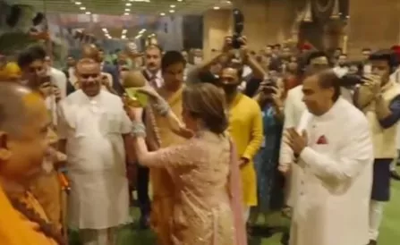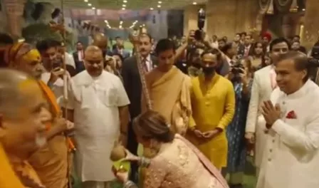 Well, Mukesh Ambani and Nita Ambani have left no stone unturned to become the most gracious hosts ever. Proof of the same was found in the manner in which the businesswoman and philanthropist gave a ceremonious welcome to the Shankaracharya of Dwarka Peeth, as well as the Shankaracharya of Jyotirmath, Swami Avimukteshwaranand. Nita did a traditional aarti with a mangal kalash in her hand, and bent down as a mark of reverence to the pious figures.