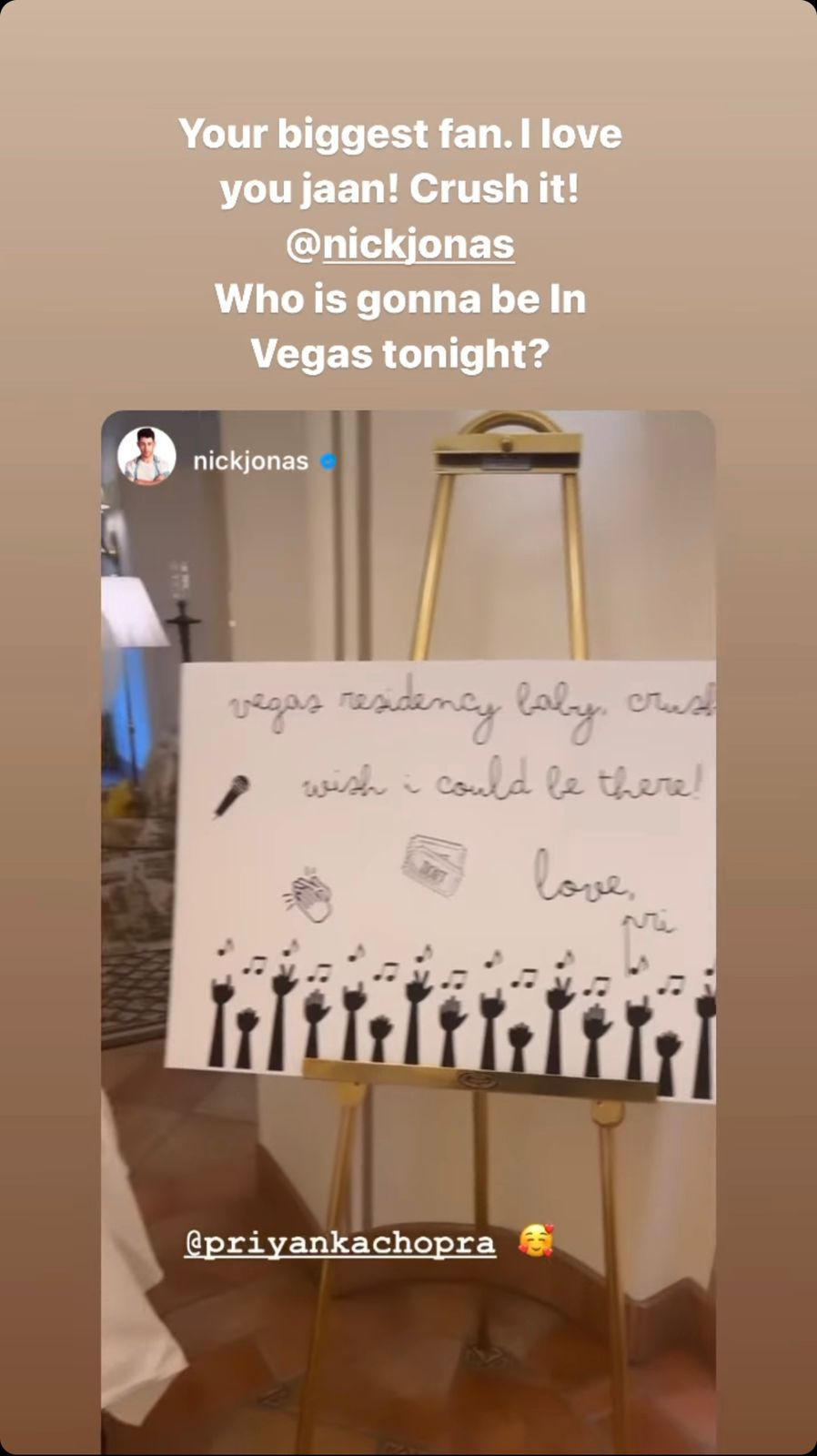 "Your biggest fan. I love you Jaan! Crush it! @nickjonas Who is gonna be in Vegas today?"