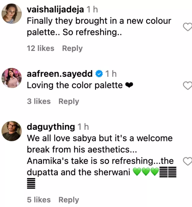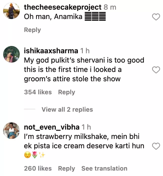 Not only us the self-acclaimed IG account, Diet Sabya was also left in awe of Pulkit's look. As soon as the IG account posted a compilation of Kriti and Pulkit's pictures as a video, fans flooded it with comments. One user wrote, "My god, Pulkit’s Shervani is too good. This is the first time I looked at a groom’s attire stole the show." Another one commented, "Never thought pink and green would look so gorgeous together!! Absolutely gorgeous, broke the curse of pastels . The colors are back. Motifs, the dupatta wow." One netizen wrote, "We all love sabya but it's a welcome break from his aesthetics... Anamika's take is so refreshing...the dupatta and the sherwani."